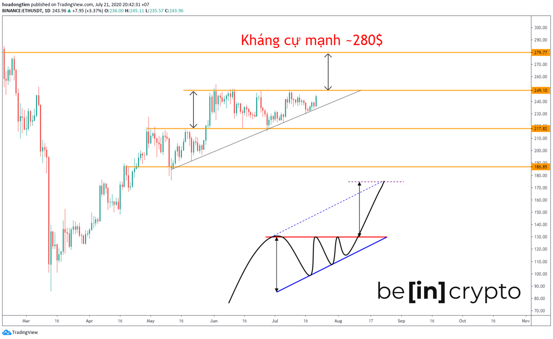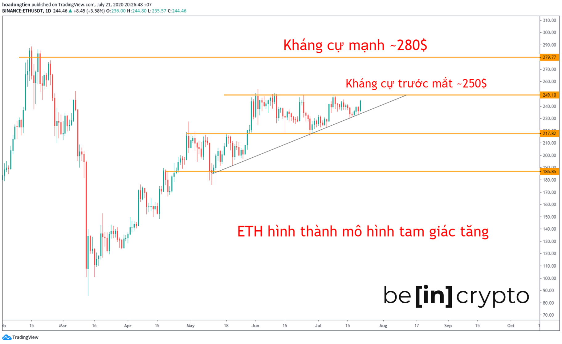 - Cho dù bạn đối diện với một mô hình tam giác tăng thiên về tăng giá, cũng đừng quên khả năng false breakout vẫn hiện hữu. Dù sao ETH cũng đã tăng một đoạn dài, chỉ nên vào lệnh khối lượng nhỏ nếu đánh lên. Trong thị trường tiền điện tử, ETH biến động từ 250 lên 280 chẳng hạn cũng không hẳn là một biến động “quá lớn” so với những gì mà nó đã thể hiện vào hồi đầu tháng 3.