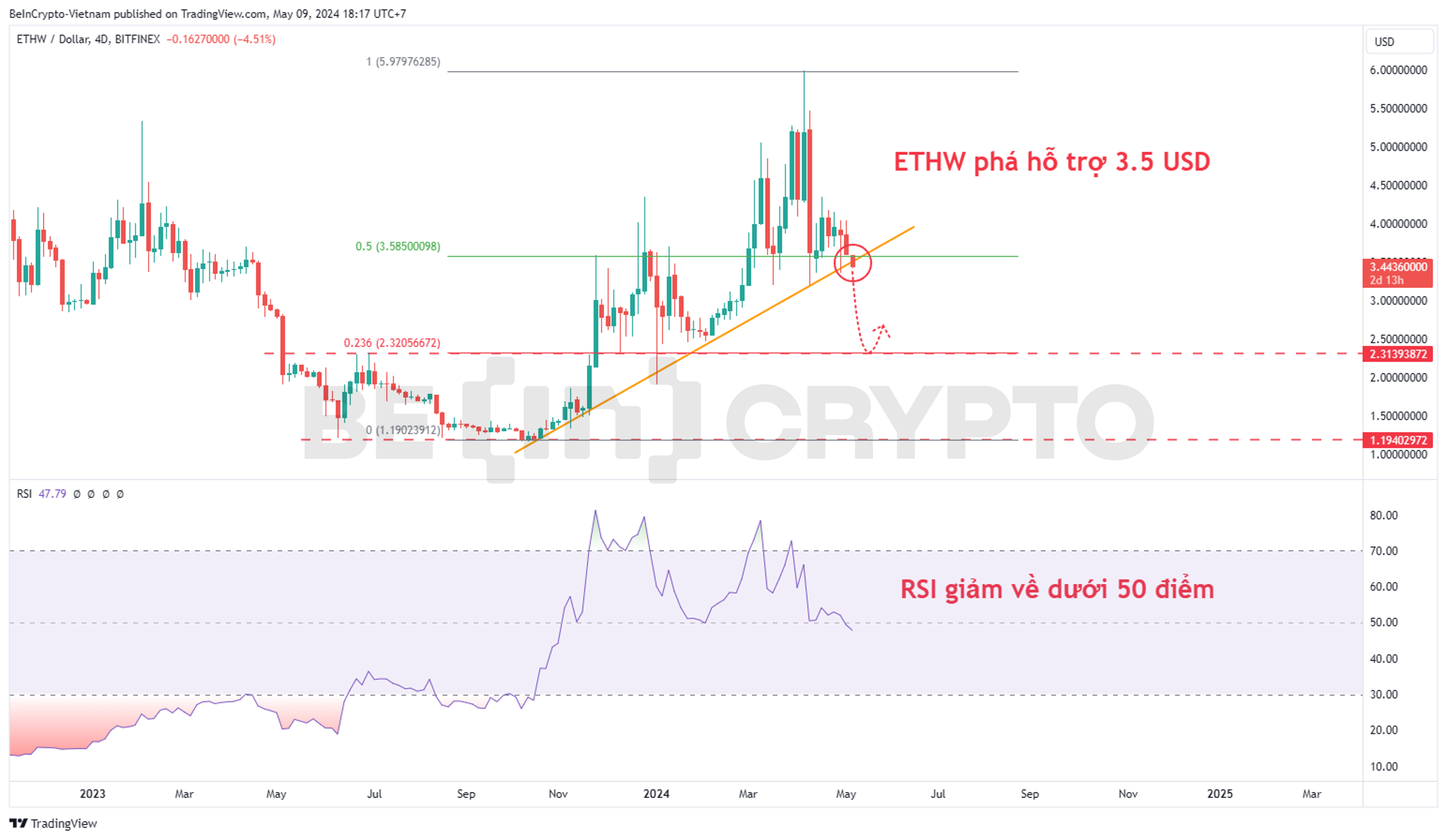 - Đà tăng giá của ETHW từ cuối năm ngoái đến tháng 4/2024 duy trì trên trendline cấu trúc tăng (màu cam). Nhưng những ngày đầu tháng 5 này, trendline cấu trúc tăng đã bị phá vỡ. Đồng thời ETHW cũng phá hỗ trợ 3.5 USD tương đương fibonacci 0.5.