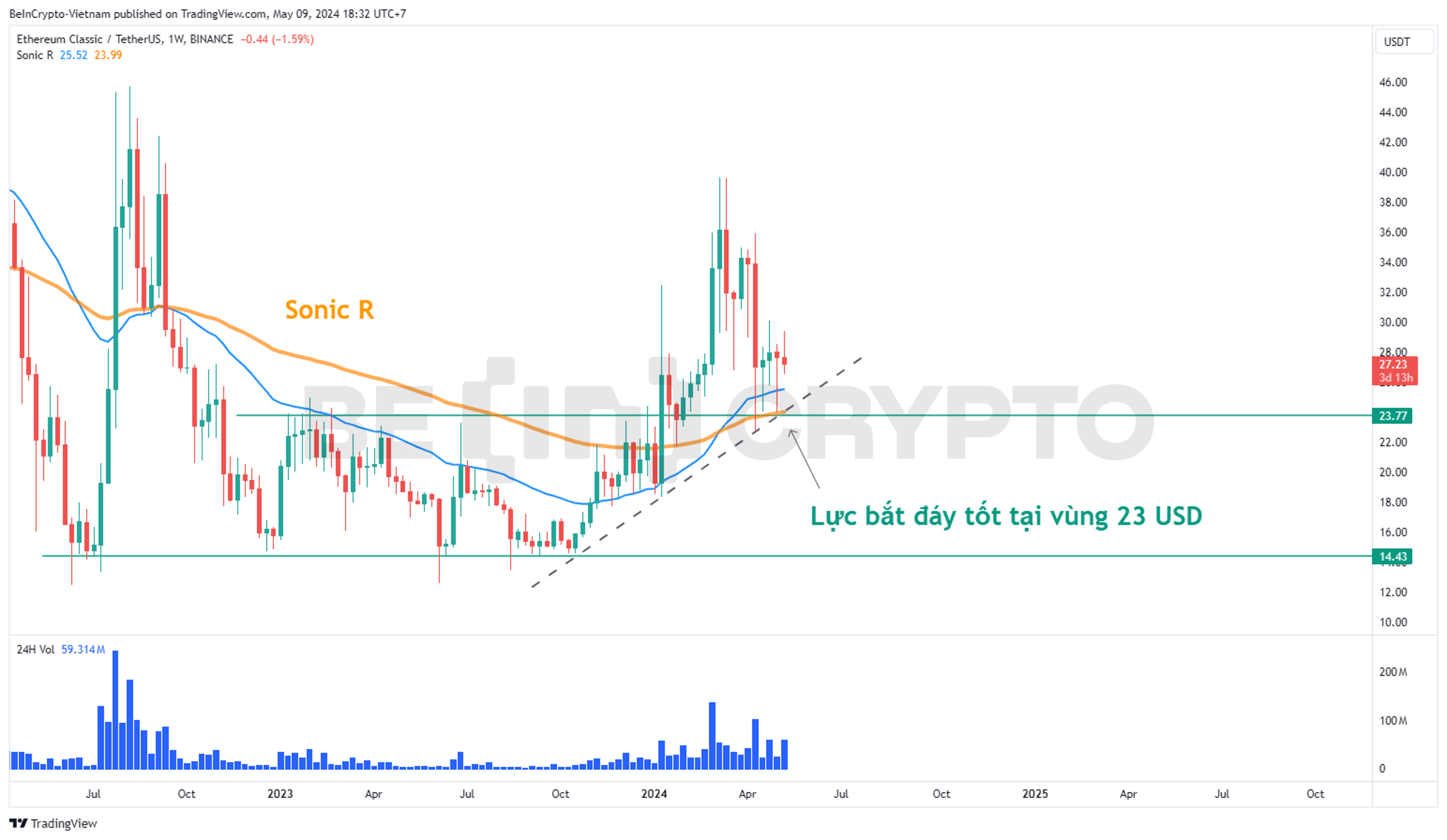 - Hai đường trung bình động hàm mũ EMA34 và EMA89 của chỉ báo Sonic R đã xác nhận giao cắt dương từ quý đầu năm 2024. Và hỗ trợ mạnh tại EMA89 là tại vùng 23 USD. Đây cũng chính là ranh giới của vùng tích lũy năm 2023, nay trở lại hỗ trợ đáng chú ý nhất cho ETC năm 2024.