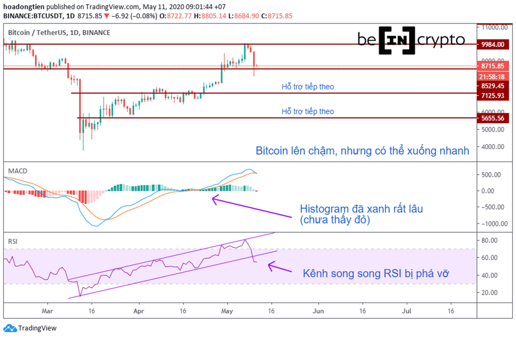 Nhìn vào quá khứ gần đây, Bitcoin đi lên mất rất nhiều thời gian, nhưng khi đi xuống thì chỉ cần một lần dump là coi như xóa sạch mọi nỗ lực của phe bò. Một vài dấu hiệu xấu, như histogram của MACD chớm đỏ (chưa xác nhận), kênh song song của RSI bị phá vỡ.