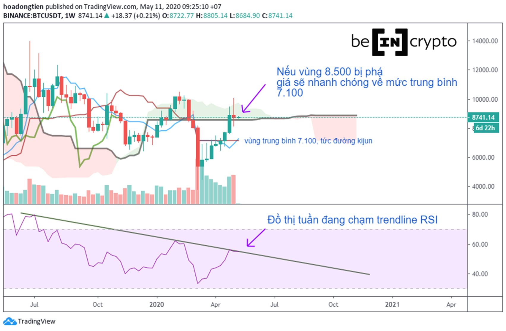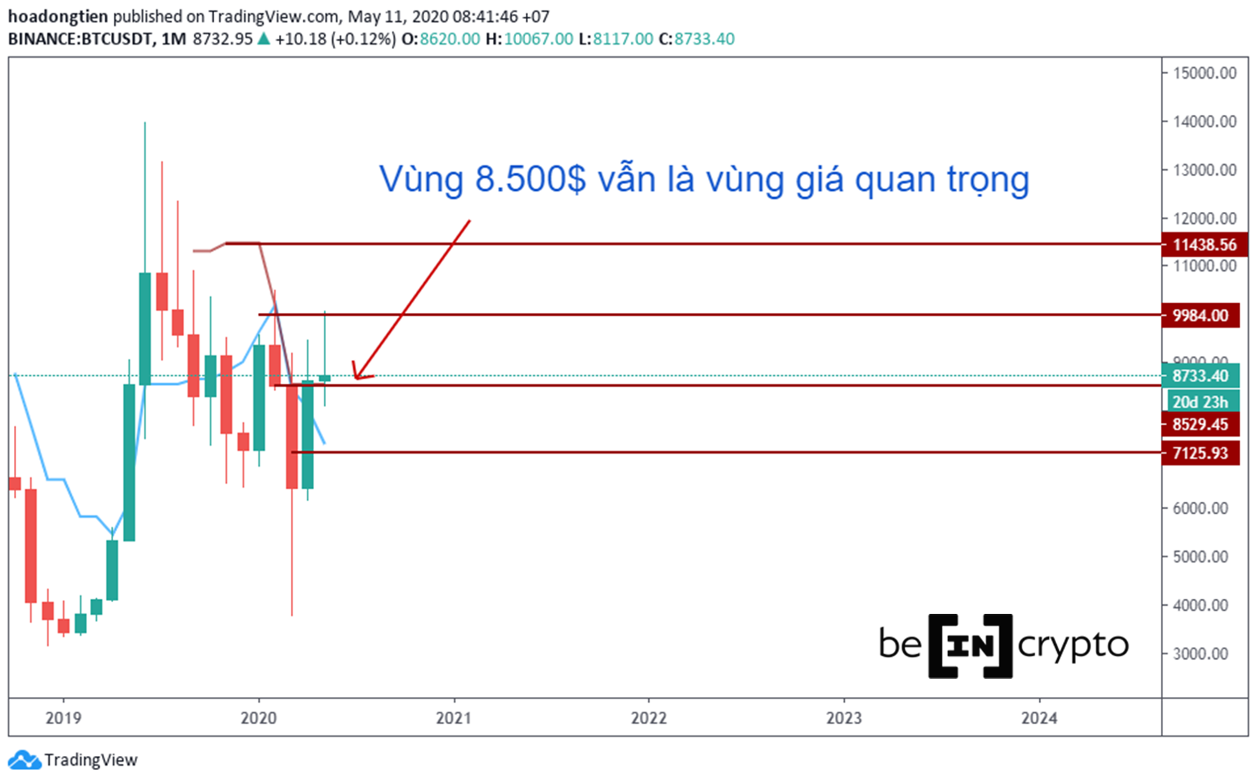 Chúng tôi vẫn bảo lưu quan điểm vùng 8.500 đô la là vùng giá quan trọng. Nến tháng 5 vẫn chưa đi hết được 1/2 quãng đường, vẫn còn rất nhiều thời gian cho đến khi đóng nến. Việc nến tháng đóng cửa trên hay dưới 8.500 đô la sẽ ảnh hưởng lớn đến cục diện thị trường thời gian dài.