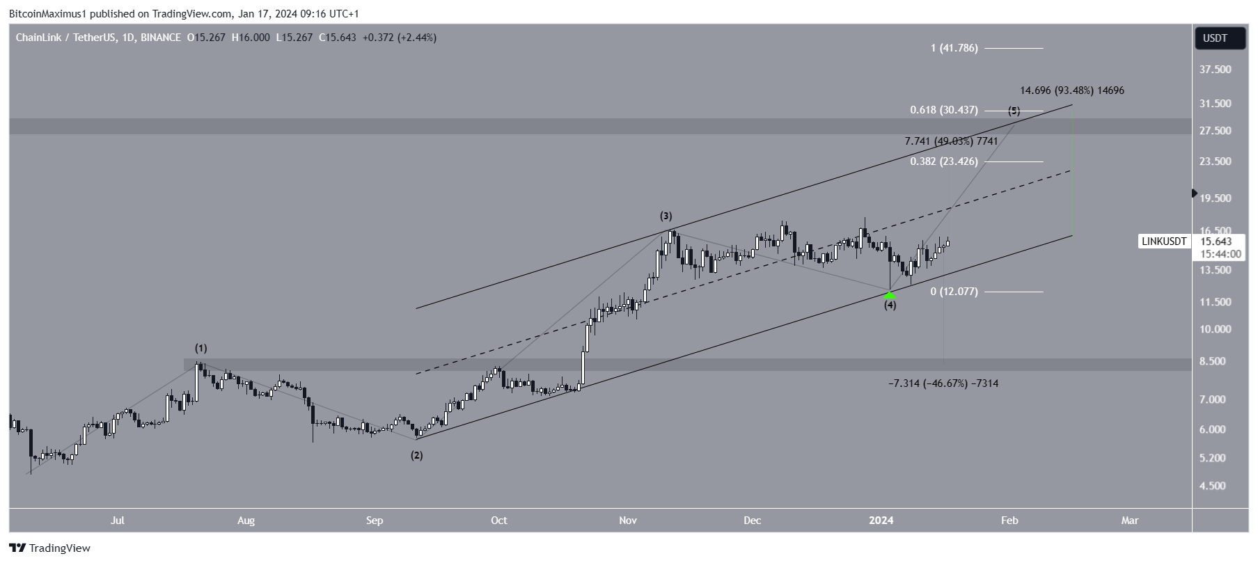 Nếu số lượng chính xác, LINK sẽ tăng lên 23.40 USD và có thể là 30.40 USD. Các mục tiêu được tìm thấy bằng cách mở rộng sóng năm lên 0,382 và gấp 0,618 lần độ dài của các sóng khác cộng lại. Chúng đại diện cho mức tăng lần lượt là 50% và 95%. Mục tiêu thứ hai cũng sẽ chạm đến đường xu hướng kháng cự của kênh.