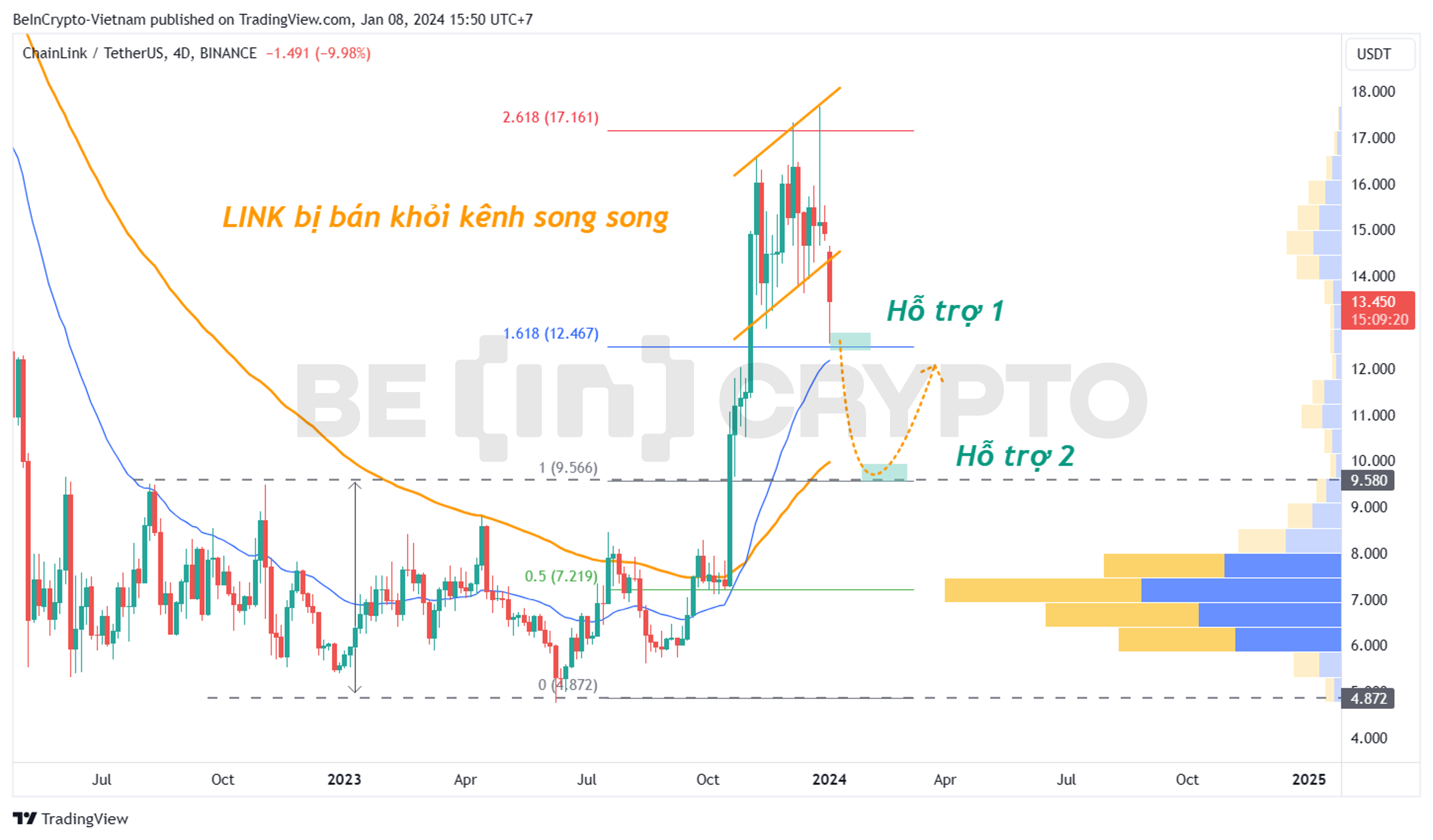 - Về kỹ thuật, LINK đã phá vỡ kênh giá song song của tháng 12 năm ngoái và giảm về mức giá của tháng 11. Chỉ báo Volume Profile cho thấy vùng giá từ dưới 14 USD đến 9.5 USD không phải là vùng thanh khoản lớn, giá LINK dễ bị giảm nhanh khi đã biến động dưới 14 USD.