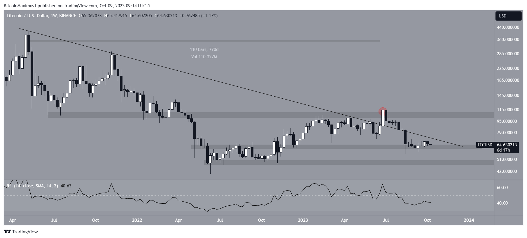 Phân tích kỹ thuật LTC cho thấy giá đã giảm kể từ khi đạt mức cao hàng năm là 115 USD vào tháng 7. Giá sau đó cũng đã phá vỡ đường xu hướng hỗ trợ tăng dần ngắn hạn.