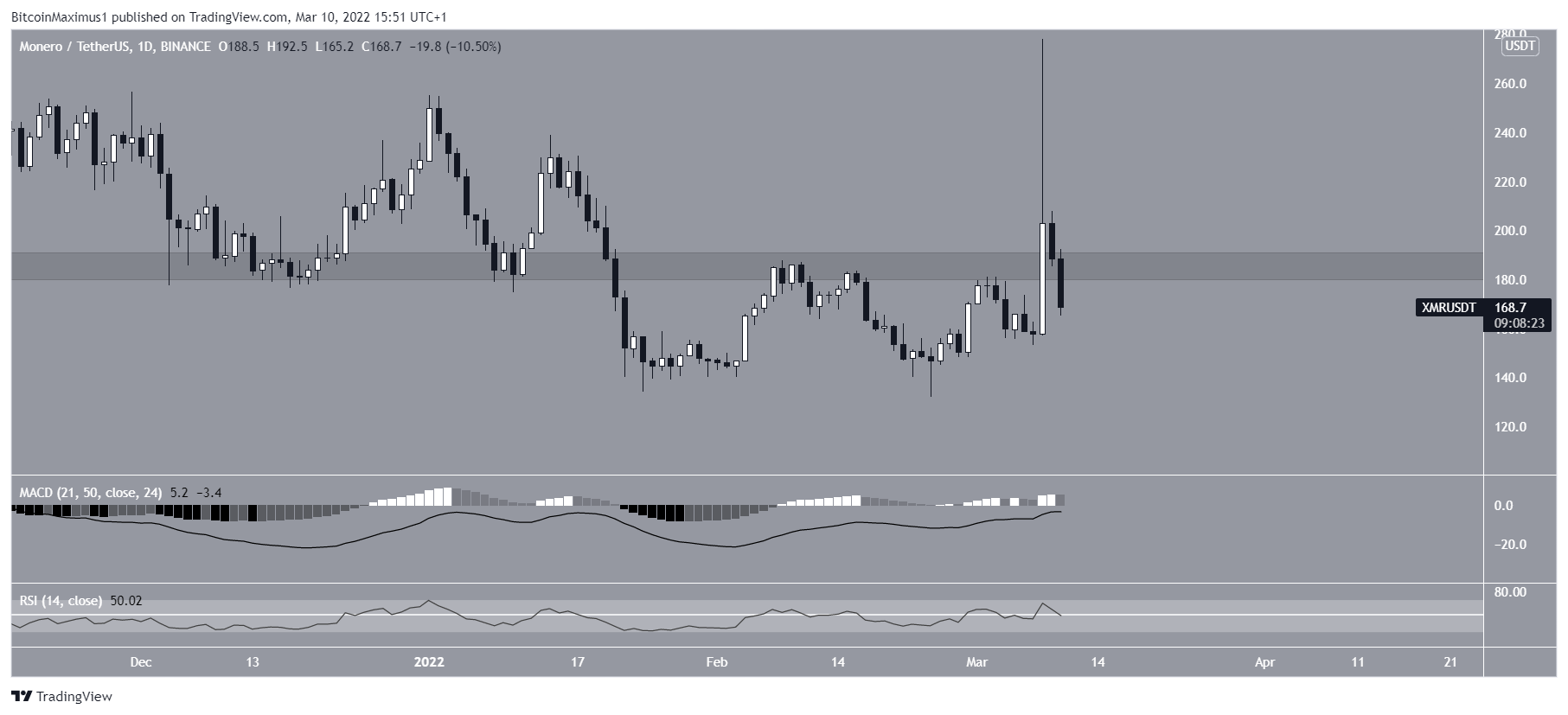 Mặc dù giá XMR đã diễn biến theo đường hỗ trợ tăng dần kể từ ngày 24 tháng 2, nhưng nó vẫn chưa xác nhận vùng 180 USD là mức hỗ trợ. Sau khi bứt phá, giá đã giảm xuống dưới mức đó. Khu vực 180 USD hiện dự kiến sẽ cung cấp mức kháng cự.