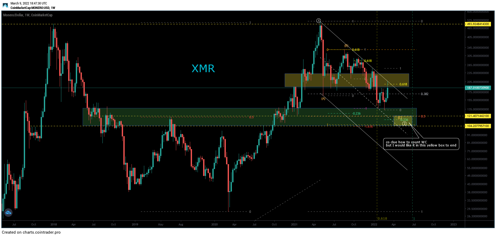 Với sóng W: Y (trắng) theo tỷ lệ 1: 0.618 thì mức giá thấp nhất của XMR là 104 USD. Điều này cũng sẽ xác thực đường hỗ trợ của kênh một lần nữa.