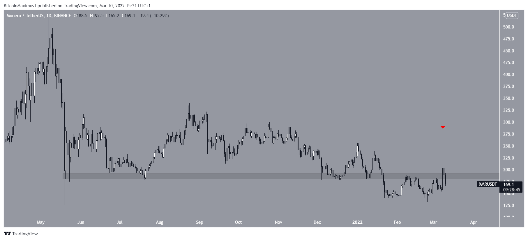 Tuy nhiên, xu hướng tăng đã không được duy trì và XMR gặp ngay phải áp lực bán mạnh nên đã tạo ra một cây nến với bóng trên dài (biểu tượng màu đỏ). Vào ngày 10 tháng 3, giá XMR đã gần như quay về lại điểm xuất phát.