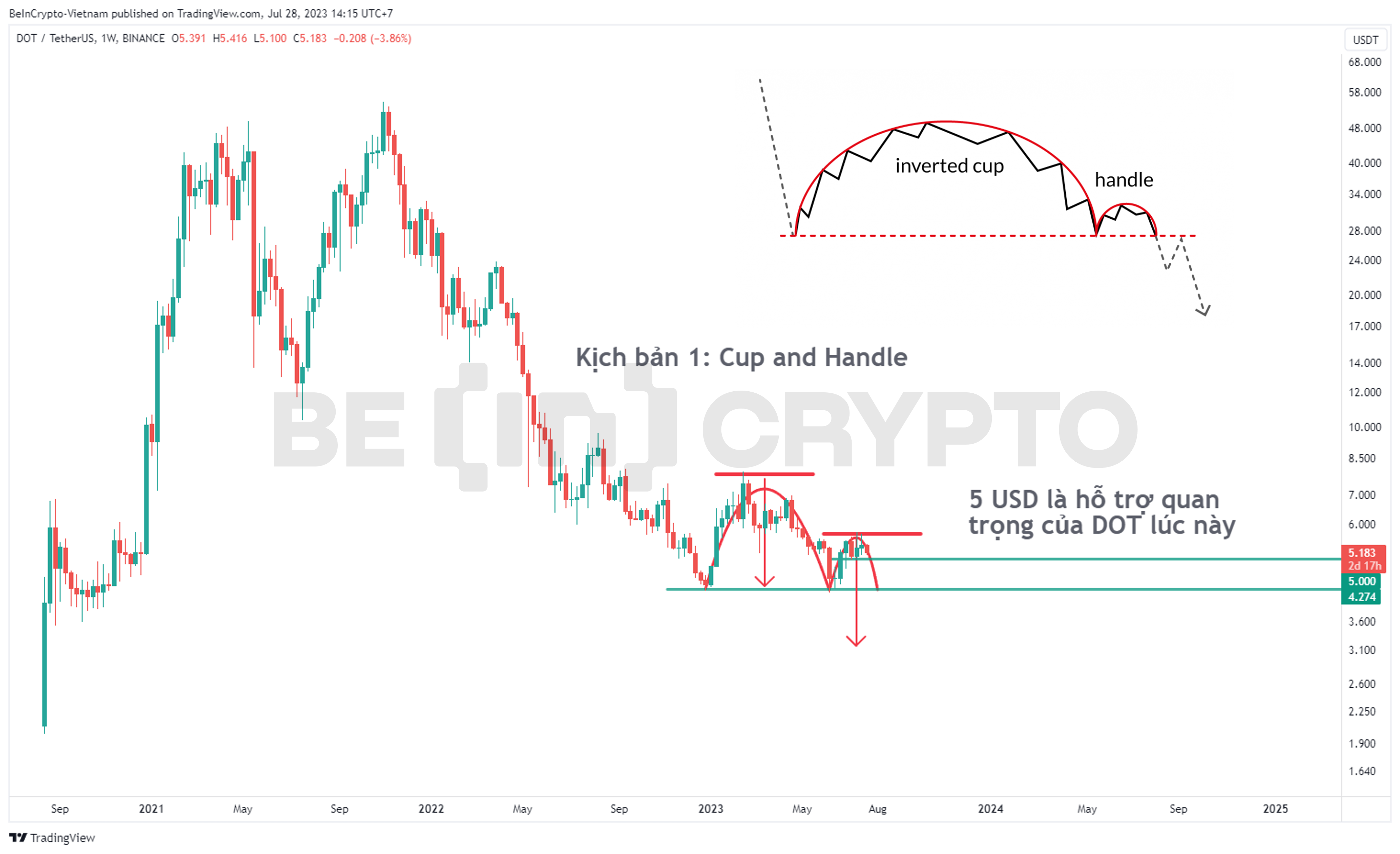 Do đó, nếu đà điều chỉnh này một lần nữa về lại đáy cũ thì DOT có khả năng sẽ hoàn thành mô hình Cốc và tay cầm ngược (Inverted Cup and Handle). Phép đo giá của mô hình này hướng DOT đến 3.5 USD – 3 USD. Tuy nhiên, trước mắt 5 USD là vùng hỗ trợ quan trọng để phân biệt liệu kịch bản này có khả năng xảy ra cao hơn kịch bản sau hay không.