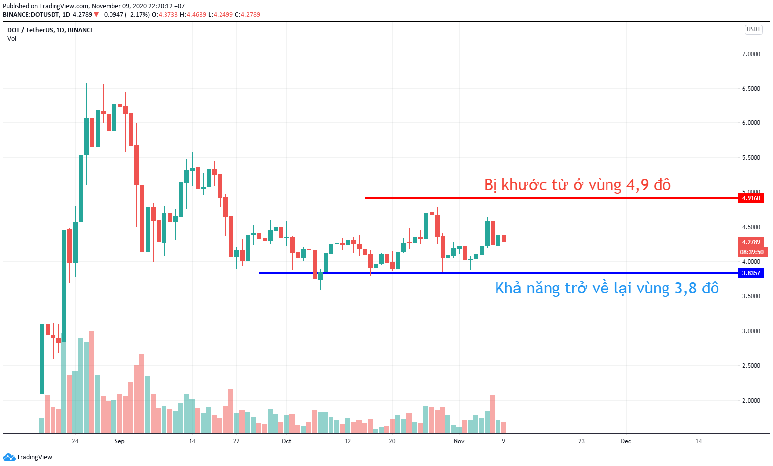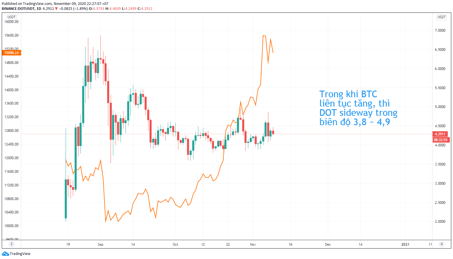 - Trong khi giá Bitcoin liên tục tăng từ giữa tháng 9 đến nay, thì DOT chỉ có thể suy giảm hoặc sideway trong biên độ 3,8 ~ 3,9.