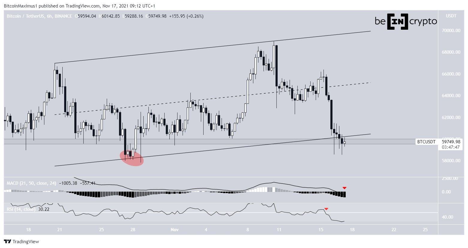 Vào ngày 16 tháng 11, BTC đã quay về đường hỗ trợ của kênh và vùng hỗ trợ 59,700 USD. Tuy nhiên, trước đó vào ngày 27 tháng 10 giá BTC đã đi chệch và giảm sâu hơn xuống dưới các mức hỗ trợ này.