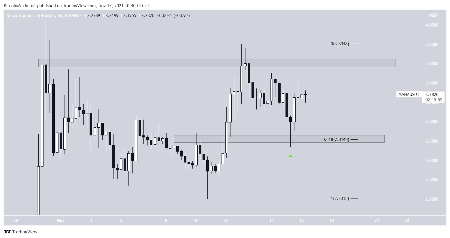 Vào ngày 16 tháng 11, Decentraland (MANA) đã bật lên tại vùng hỗ trợ ngang 2.81 USD (biểu tượng màu xanh lá cây). Đây cũng là mức hỗ trợ 0.618 Fib thoái lui .