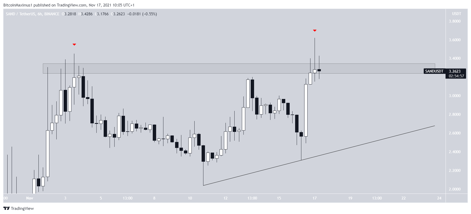 Sandbox (SAND) đã tăng lên trên đường hỗ trợ tăng dần kể từ ngày 10 tháng 11. Điều này đã đưa SAND thiết lập đỉnh lịch sử mới tại 3.61 USD vào ngày 17 tháng 11.