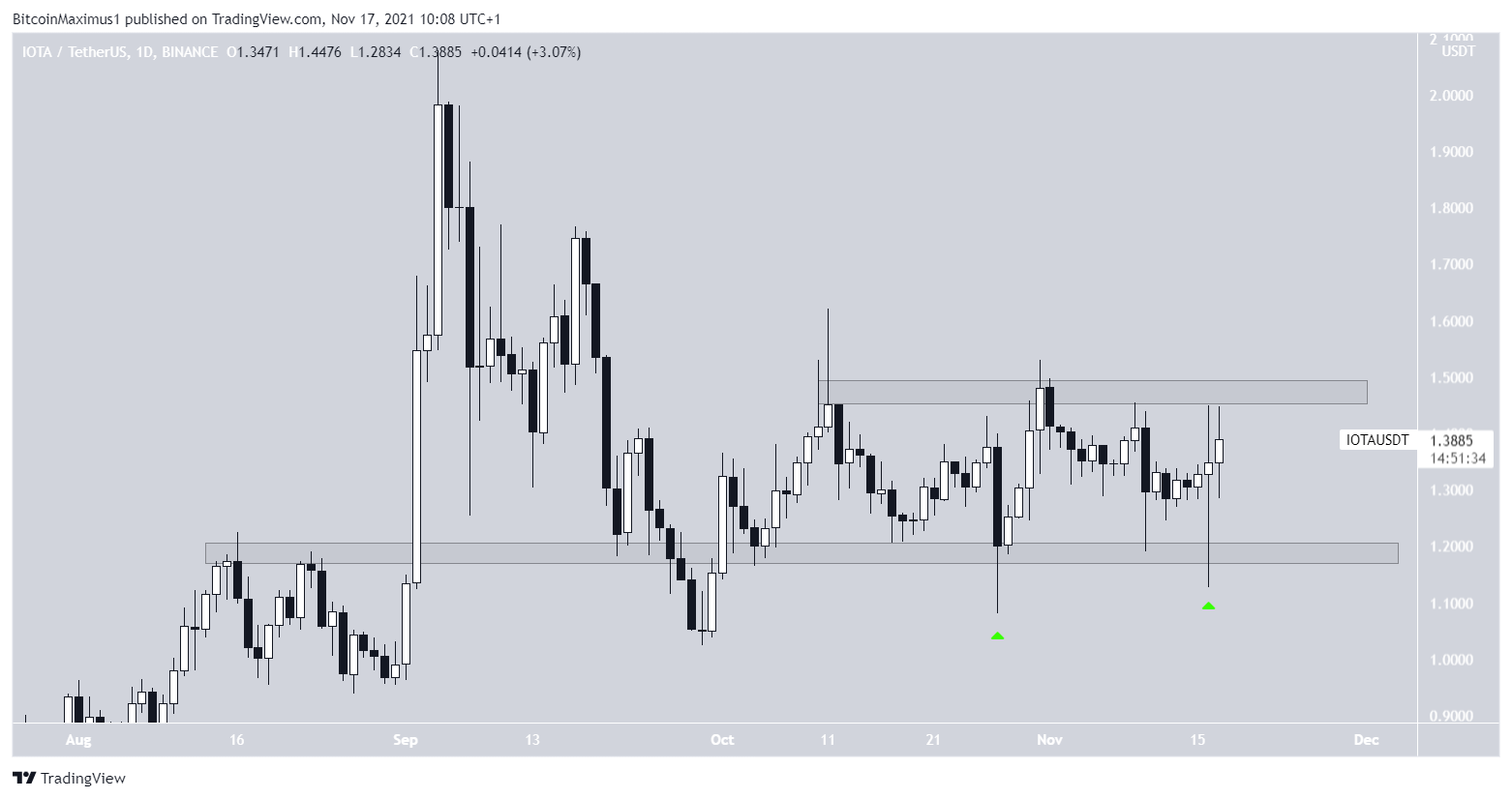 Giá IOTA đã biến động trong biên độ từ 1.18 USD đến 1.50 USD kể từ ngày 4 tháng 10. Nó đã bật tăng hai lần tại mức hỗ trợ của biên độ dao động này (biểu tượng màu xanh lá). Tại các đợt bật tăng đều tạo ra những cây nến có bóng nến dưới dài cho thấy áp lực mua quay trở lại tại vùng giá này.