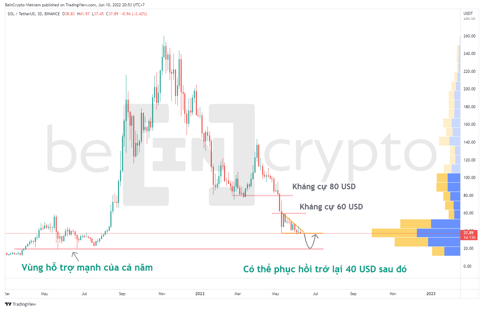 - Nhưng tại 40 USD này SOL đã có phục hồi mạnh mẽ lên 60 USD và từ đó hình thành nên mô hình tam giác giảm như trên. Theo lý thuyết phân tích kỹ thuật, đây là một mô hình dự báo giảm giá. Giá không thể tạo một đỉnh cao hơn trước và liên tục test lại 40 USD.