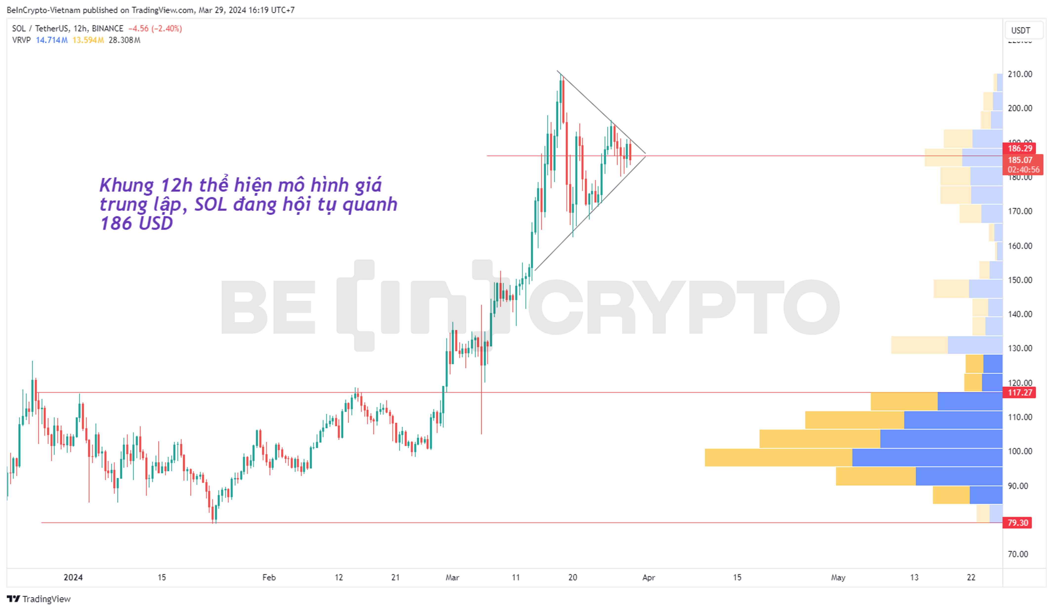- Trong khung 12h, SOL cho thấy giá đang hội tụ quanh mức 186 USD từ giữa tháng 3 cho đến nay. Quá trình hội tụ này tạo nên mô hình tam giác cân và giá đã tiến gần đến vùng hẹp dự báo giá sẽ sớm khẳng định trạng thái tâm lý mới. Từ đây, nhà giao dịch ngắn hạn có thể có được tín hiệu sớm.
