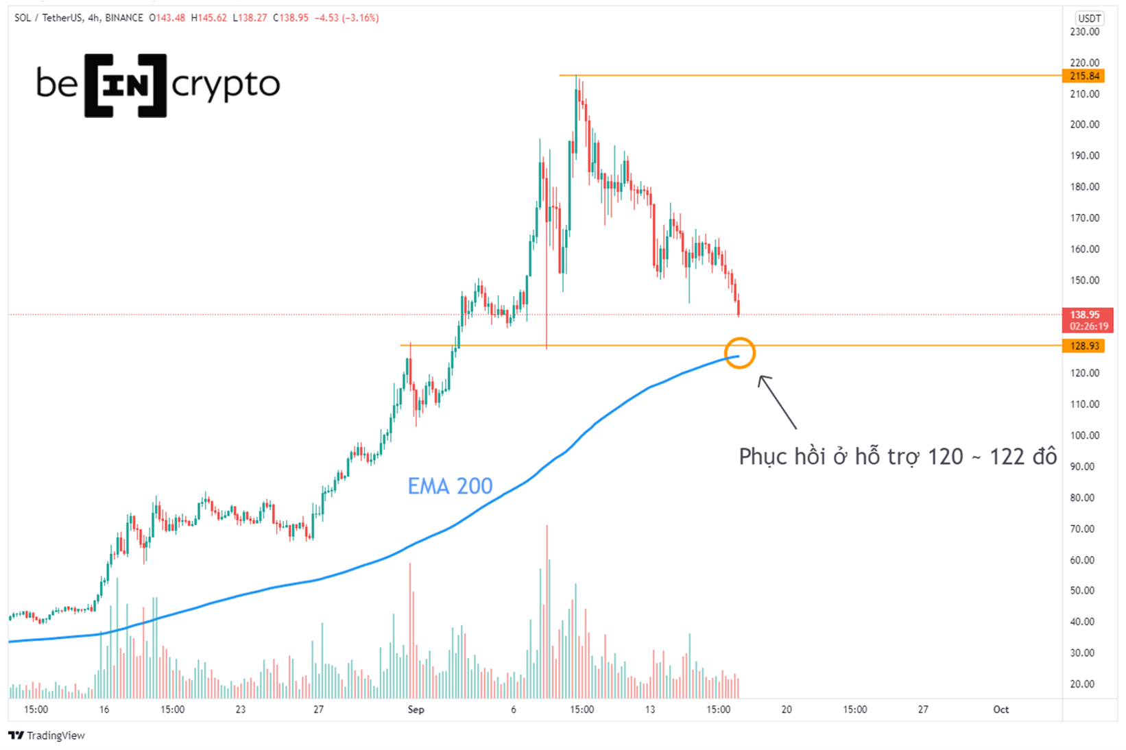 - Nếu sử dụng đường EMA 200 – vốn được xem là đường trung bình động vạch ra mức hỗ trợ tốt – thì giá SOL đang tiệm cần đường EMA 200 này. Mức giá kỳ vọng SOL sẽ chạm và phục hồi: là trong khoảng 120 ~ 122 đô la.