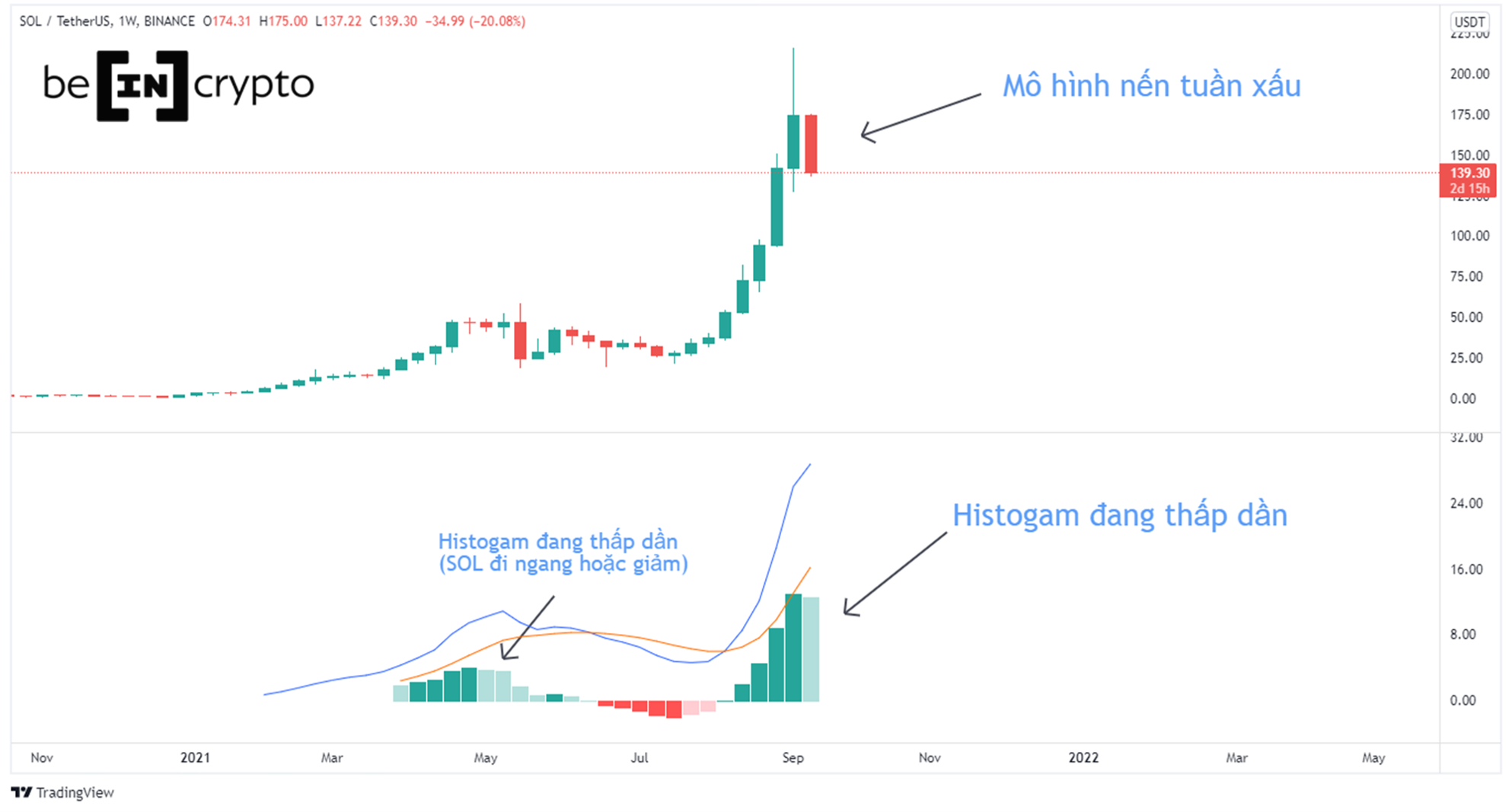 Quan sát biến động giá của SOL trong khung W1 với mô hình nến và chỉ báo MACD.