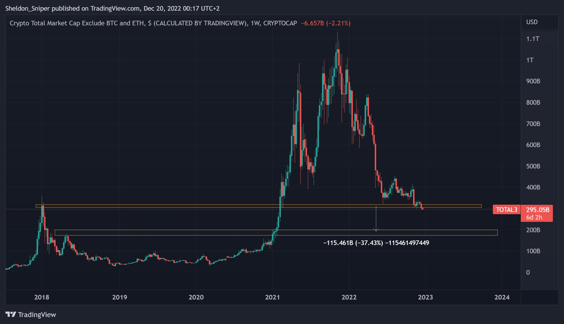 Từ hai quan sát trên, điều đáng quan tâm lúc này là khả năng liệu vùng hỗ trợ 430 tỷ USD có bị phá vỡ để kích hoạt đà giảm hay không? Một quan sát từ @Sheldon_Sniper cho chúng ta tín hiệu sớm. Đó là tín hiệu từ biểu đồ vốn hóa Altcoin nhưng không tính đến Ethereum.