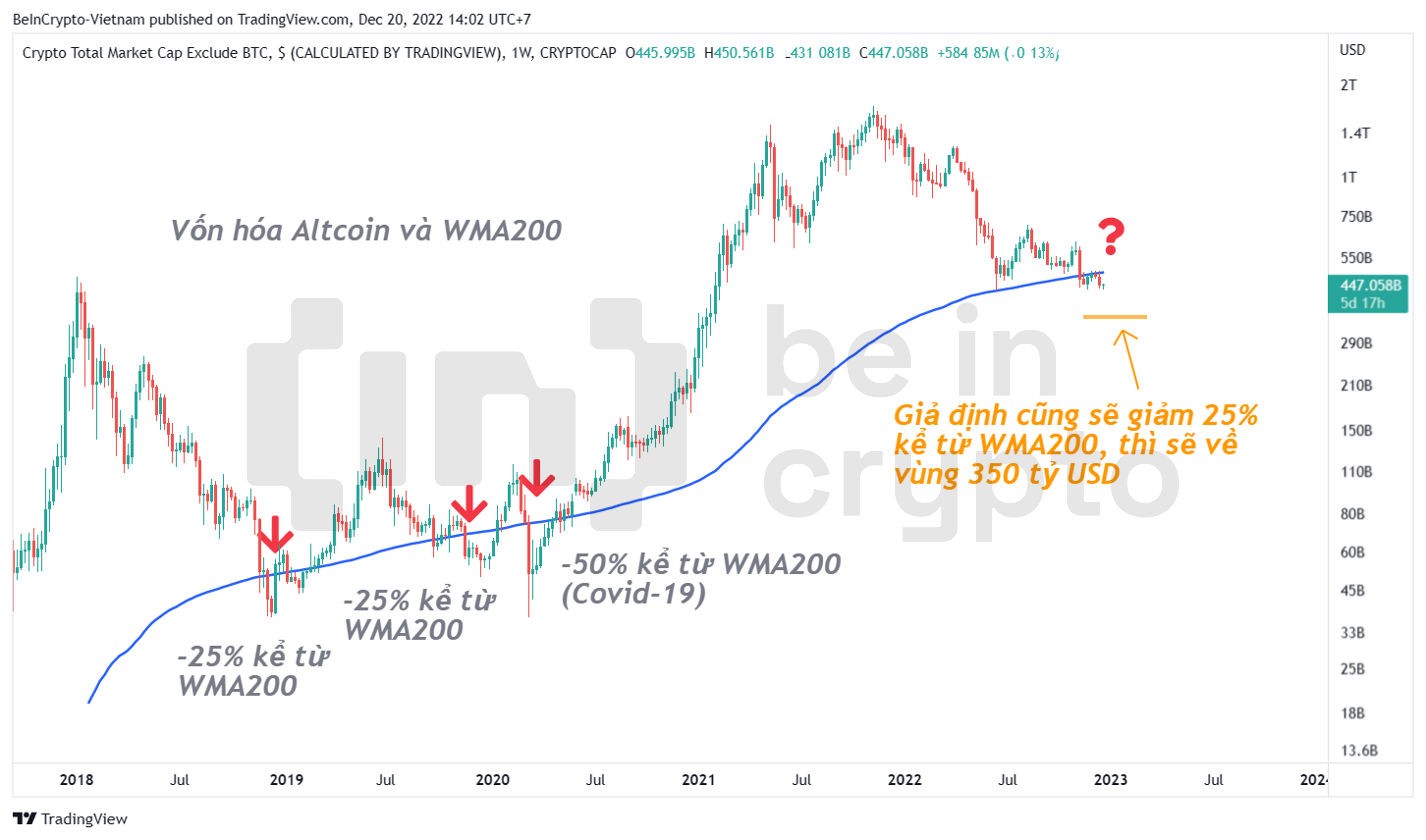 Sponsored Sponsored- Trong những đợt downtrend trước, vốn hóa Altcoin thường kết thúc downtrend bằng việc giảm dưới đường WMA200 (đường trung bình khung tuần chu kỳ 200). Và biên độ giảm là từ 25% – 50% kể từ WMA200. Lần giảm tồi tệ nhất là -50% trong giai đoạn khủng hoảng Covid-19.
