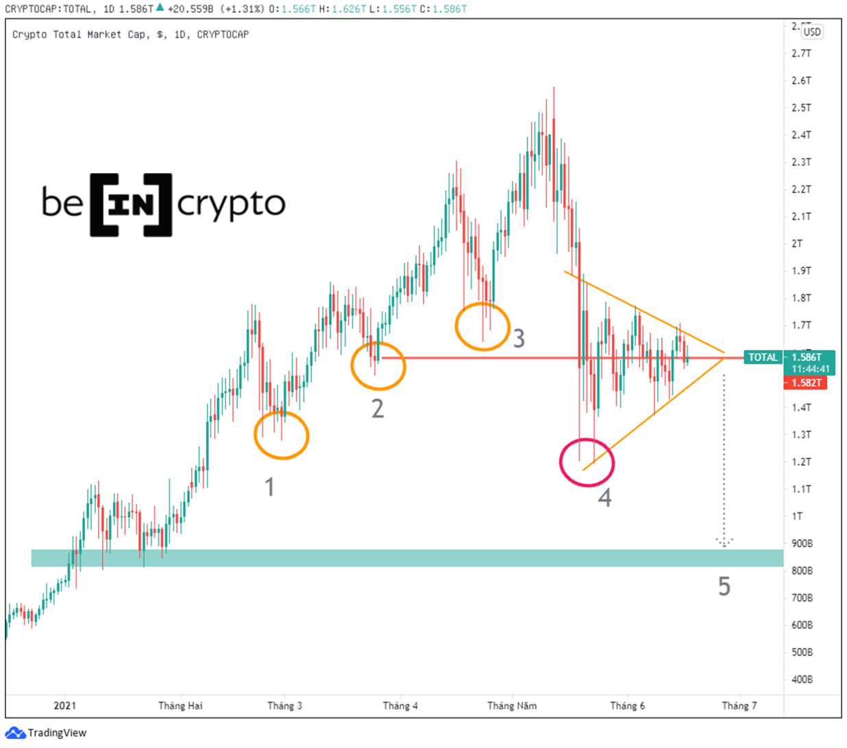 Nhưng nếu quan sát tổng vốn hóa, thì dường như biến động vẫn đang rất “bài bản” theo góc nhìn mô hình giá của phân tích kỹ thuật. Mọi biến động gần đây của tổng vốn hóa vẫn nằm trong tam giác cân.