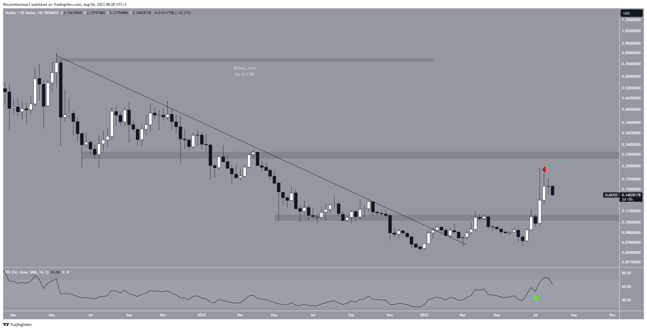 Phân tích kỹ thuật XLM dựa trên khung thời gian hàng tuần cho thấy một số diễn biến quan trọng. Yếu tố chính là sự bứt phá khỏi đường kháng cự giảm dần trong 616 ngày vào đầu tháng 1. Sau khi tạo đáy cao hơn và xác nhận đường này là hỗ trợ, XLM bắt đầu một chuyển động đi lên khác tăng tốc vào tháng 6.