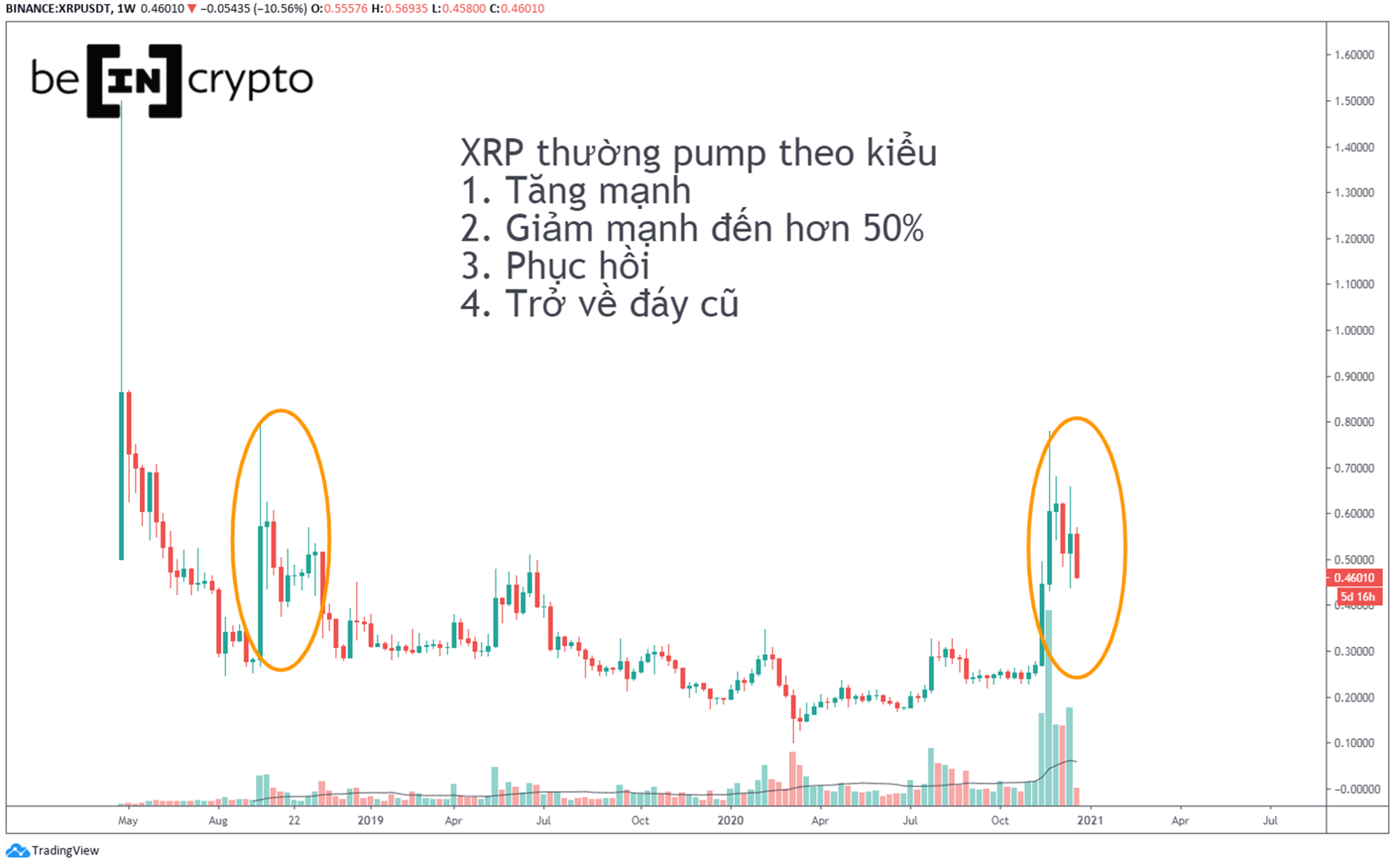 Biến động giá của XRP đi đúng theo mô típ mà nhiều lần nó đã thể hiện trong quá khứ. “Đi để trở về” – Cứ mỗi lần bật tăng mạnh đều kéo theo những đợt suy giảm đến 50% sau đó.