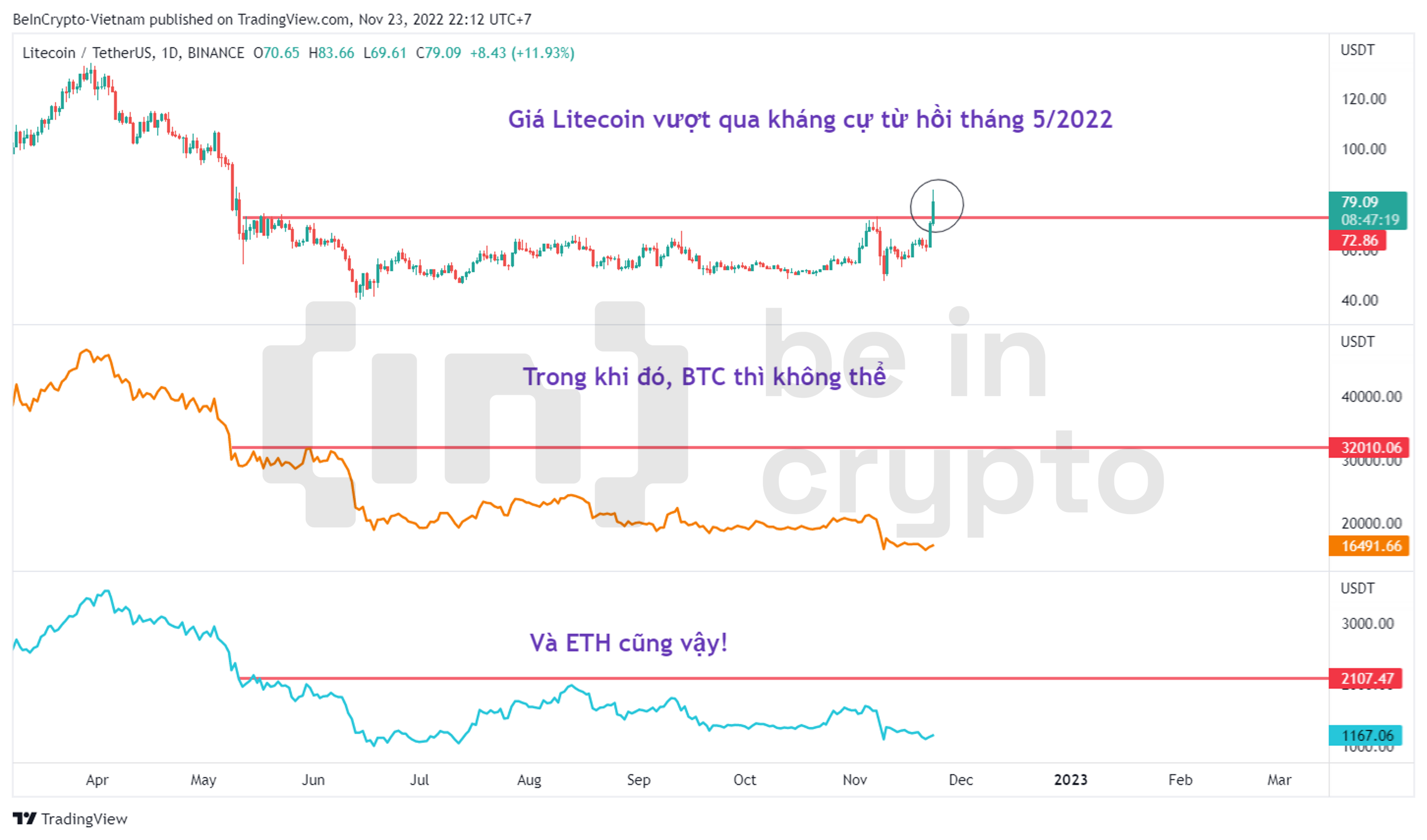 So sánh cấu trúc của cả Litecoin, Bitcoin và Ethereum thì giá LTC đã vượt qua được tất cả kháng cự từ hồi tháng 5/2022. Ethereum thì không thể tạo được một Higher High đẹp như thế. Còn Bitcoin không những không phục hồi mà còn tạo thêm đáy mới.