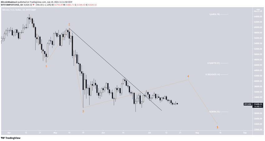 Đường xu hướng (trendline) kết nối sóng 2-4 đã bị phá vỡ. Do đó, Bitcoin bị nghi ngờ vẫn đang nằm trong làn sóng thứ năm.