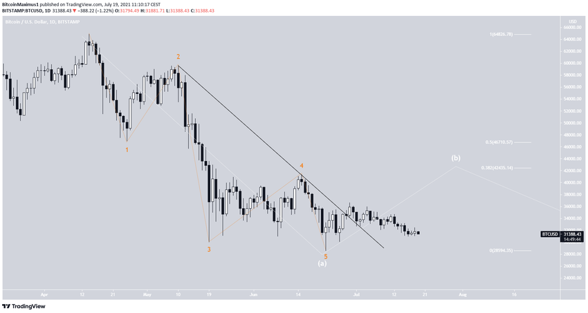 Giá của BTC đã liên tục giảm kể từ khi chạm mức ATH tại 64,895 USD vào ngày 14 tháng 4. Mức này có khả năng là đỉnh của làn sóng dài hạn thứ ba (màu đỏ) của một xung lực tăng giá đã diễn ra từ tháng 12 năm 2018.