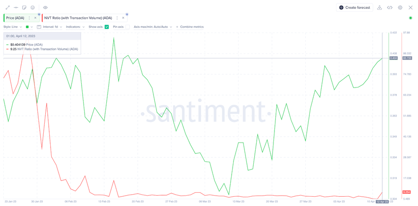 Tương tự như vậy, phân tích on-chain ADA dựa trên dữ liệu Network Value to Transaction Volume – NVT cũng đã củng cố thêm dự đoán tăng giá này. Theo Santiment, mặc dù đã vượt qua ngưỡng kháng cự 0.40 USD, nhưng ADA vẫn bị mua dưới mức giá hiện tại. Biểu đồ bên dưới minh họa rằng tỷ lệ NVT của Cardano đã đi ngang kể từ đầu tháng 2. Từ ngày 01/2 – 11/4, tỷ lệ NVT đã giảm 84% từ 58.82 xuống mức thấp 9.25.