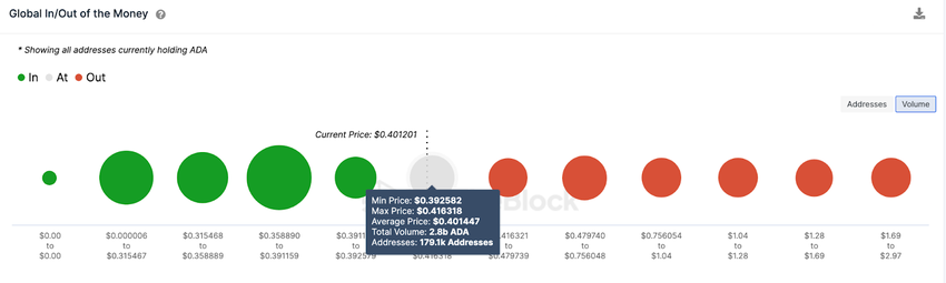 Phân tích on-chain ADA dựa vào dữ liệu Global In/Out of Money từ IntoTheBlock đưa ra dự đoán giá có thể sớm đạt 0.45 USD nếu triển vọng tăng giá diễn ra. Phe bò có thể tiếp tục đà tăng giá nếu giá ADA đột phá trên 0.41 USD. Mặc dù, nhóm 179,000 địa chỉ nắm giữ 2.8 tỷ ADA trong khu vực này có thể chốt lời một phần.