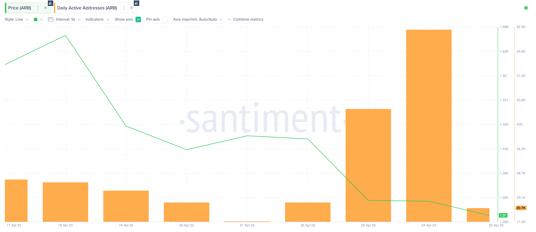 Phân tích on-chain Arbitrum cho thấy một tín hiệu tăng giá quan trọng khác là sự gia tăng gần đây về số lượng địa chỉ hoạt động hàng ngày (DAA) tương tác trên mạng. Theo dữ liệu từ Santiment, các địa chỉ hoạt động hàng ngày tương tác trên Arbitrum đã tăng trong 3 ngày liên tiếp. Kể từ mức thấp gần đây là 17,687 địa chỉ vào ngày 21/4, Arbitrum đã ghi nhận mức tăng ấn tượng 250% lên 61,886 địa chỉ vào cuối ngày 24/4.