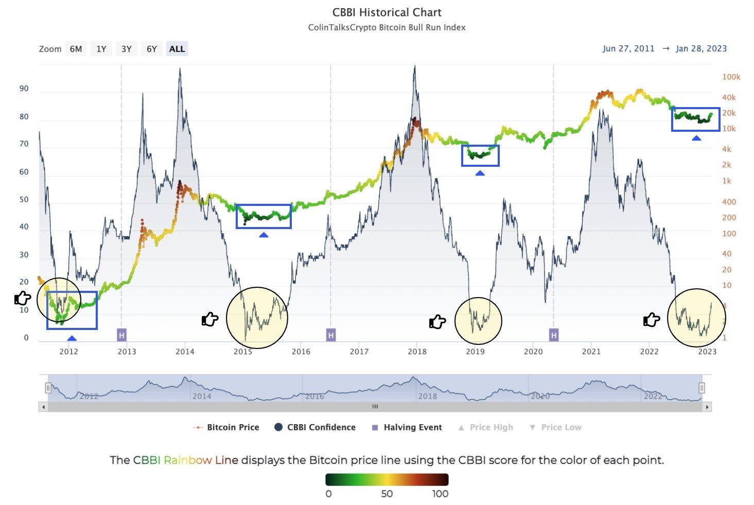 - Trong tháng cuối năm 2022 vừa qua, đã có thời điểm CBBI đạt chỉ 2 điểm. Nhưng đó chỉ mới là lời cảnh báo về việc giá BTC đang bước vào giai đoạn “đen tối” nhất. Đến tháng đầu năm 2023, việc CBBI bật lên 16 điểm đã xác nhận tín hiệu phục hồi.