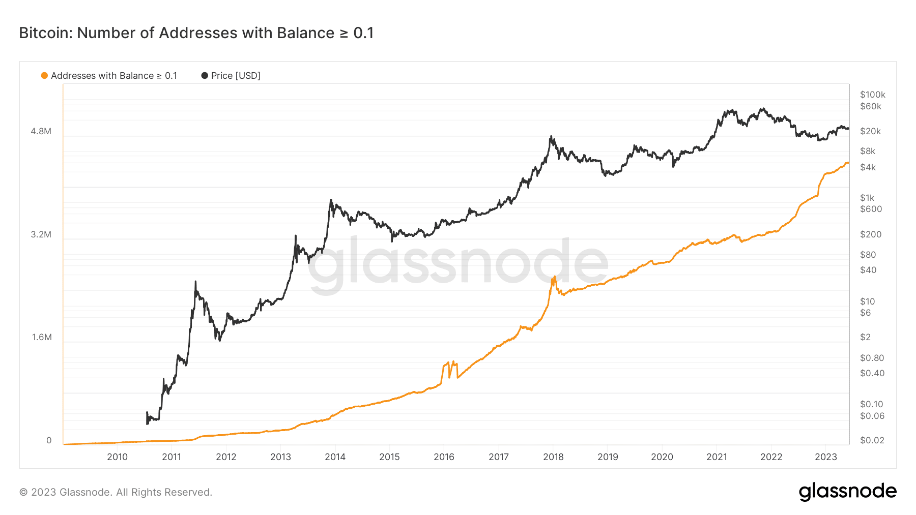 Bất chấp bối cảnh thị trường gấu giai đoạn này cũng như những biến động khó lường trước trong biểu đồ giá Bitcoin, dường như đã có một lượng lớn các địa chỉ ví nắm giữ ít hơn 1 BTC tiếp tục tích lũy thêm và gần đây đã đạt mức ATH, vượt qua 4.3 triệu ví.