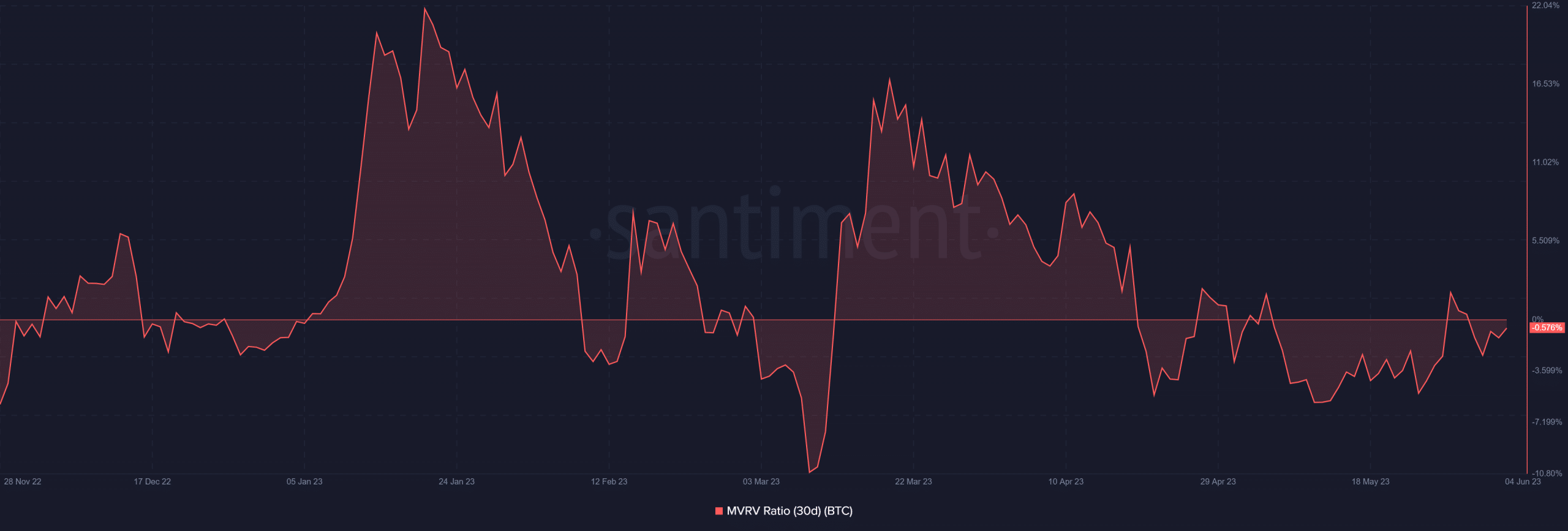 - Bắt đầu từ ngày 19/4/2023, Bitcoin đã liên tục ghi nhận giá trị MVRV âm.