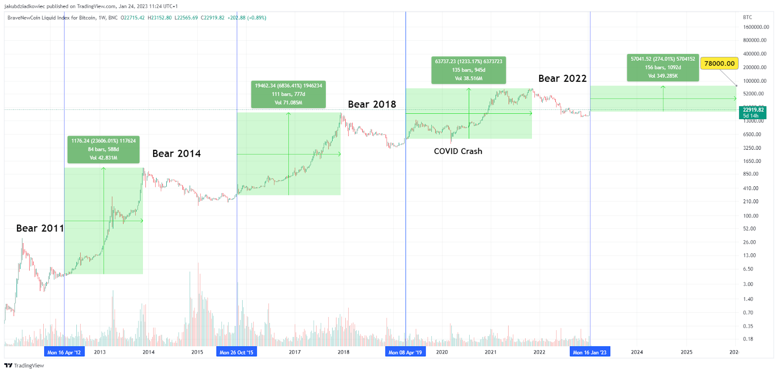 Với các tỷ lệ trên của phần mở rộng chu kỳ (trung bình 1.26 lần) và lợi nhuận giảm dần (trung bình 4.5 lần), chúng ta có thể ước tính mức cao nhất của thị trường tăng giá tiếp theo. Dựa trên các phép tính đơn giản và duy trì các tỷ lệ nhất định, chúng ta có thể tính ra mức ATH tiềm năng tiếp theo của Bitcoin là vào khoảng 78,000 USD, đạt được vào ngày 05/1/2026.