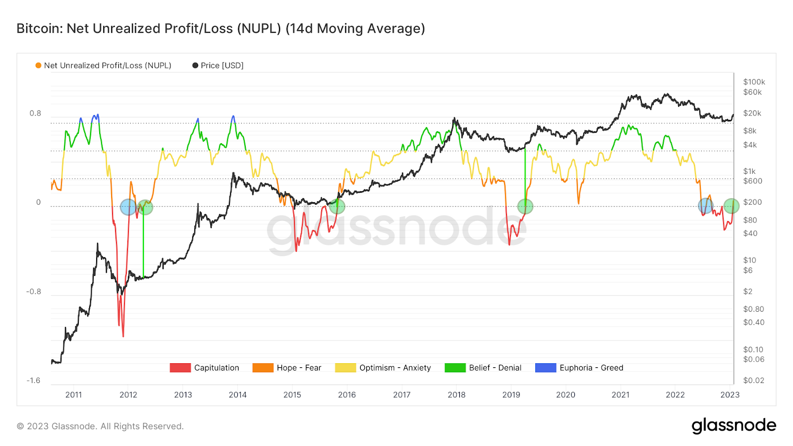Phân tích on-chain Bitcoin cho thấy hành động giá tích cực trong những tuần đầu tiên của năm 2023 đã khiến chỉ báo NUPL tạo tín hiệu bắt đầu chu kỳ tăng giá.
