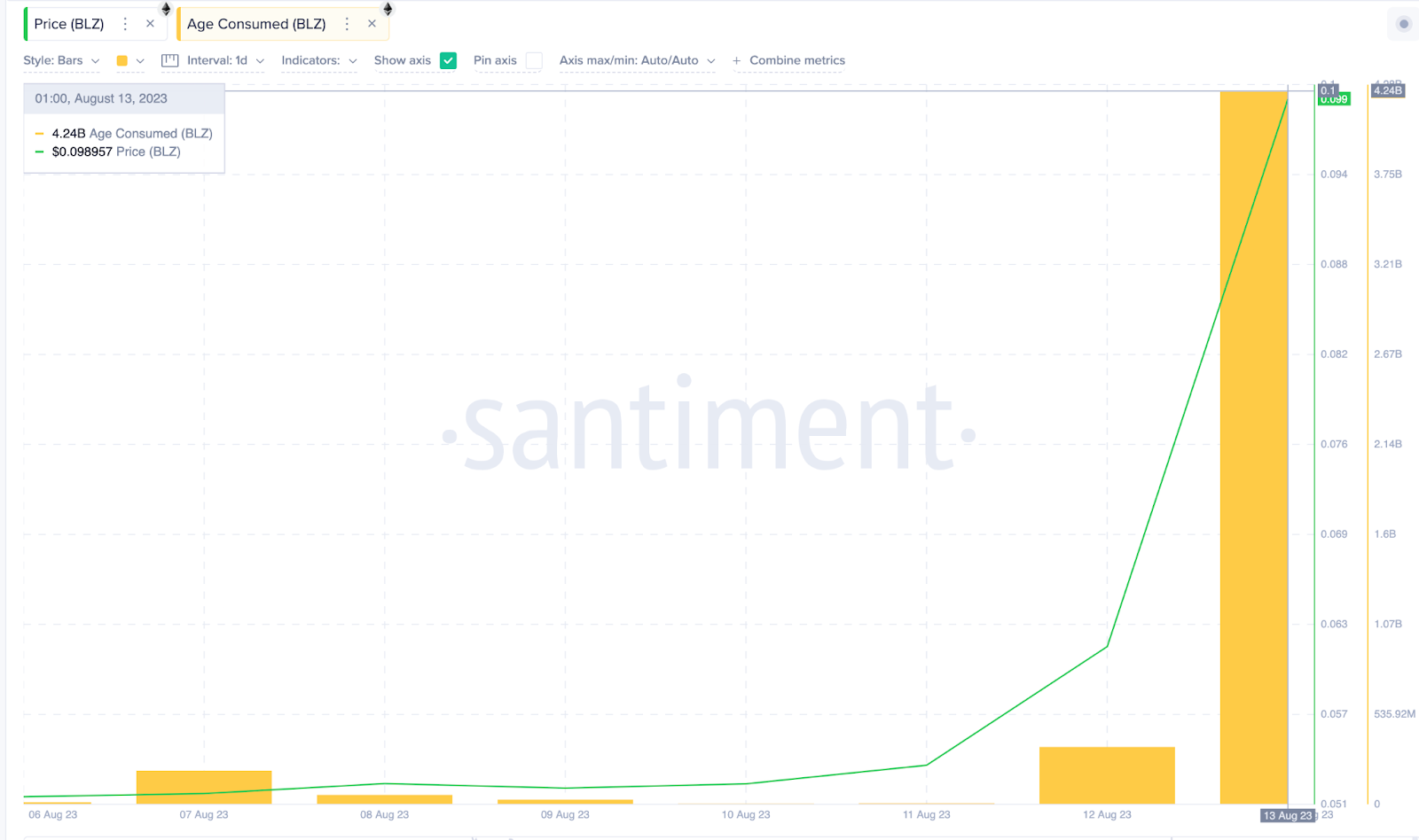 Với việc giá tăng gấp ba con số, gần 81% người nắm giữ BLZ hiện đang có lợi nhuận. Đáp lại, nhiều nhà đầu tư dài hạn đã bắt đầu chốt lời. Như được hiển thị bên dưới, dữ liệu on-chain BLZ Age Consumed đã tăng vọt lên mức cao nhất trong 1 tháng là 4.24 tỷ vào ngày 13/8. Đây là mức tăng đáng kể so với mức 341.77 triệu được ghi nhận vào ngày hôm trước.