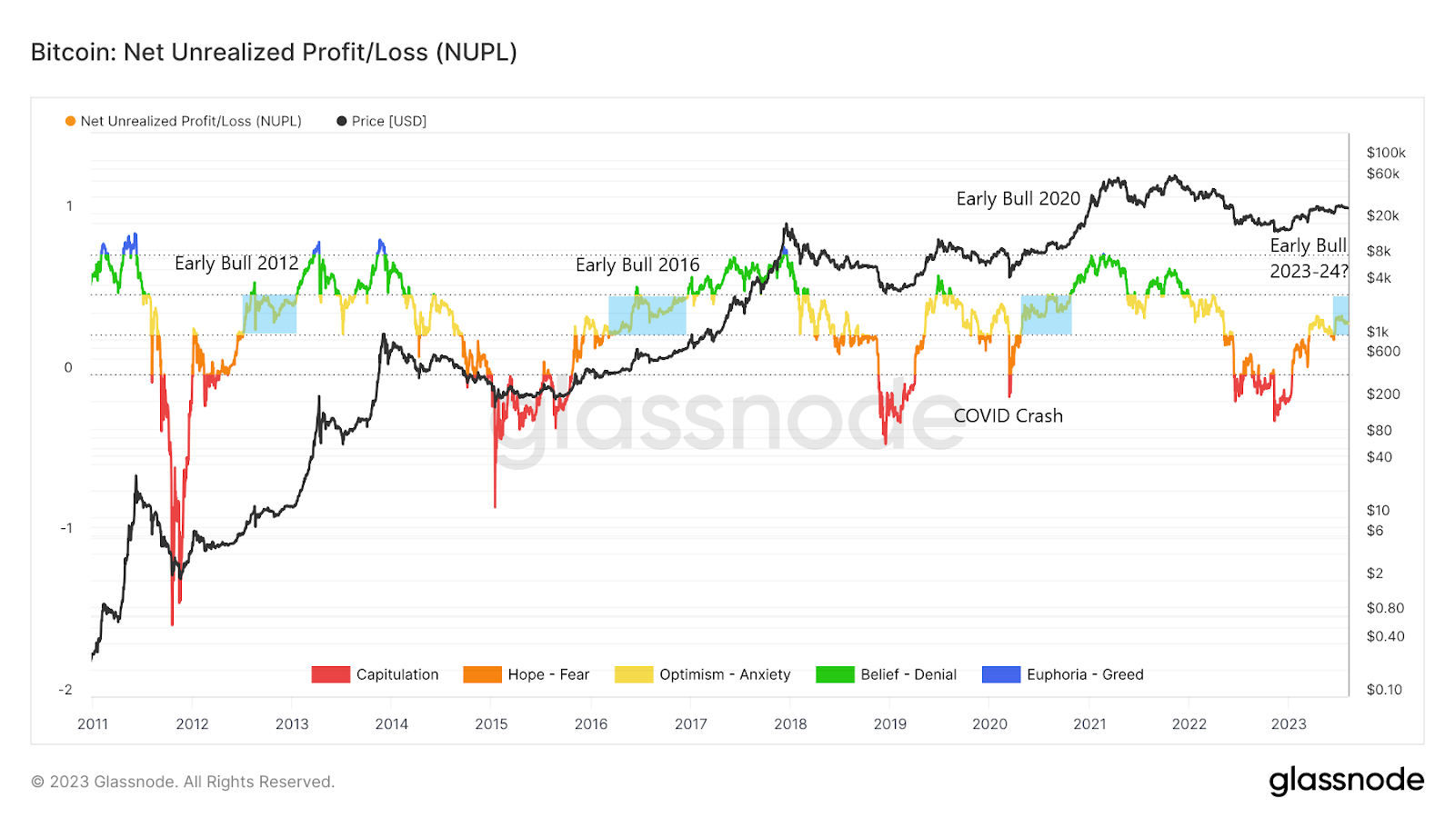 Hiện tại, phân tích on-chain BTC cho thấy NUPL đang nằm trong phạm vi màu vàng trong khoảng 0.25 – 0.50. Điều này cho thấy sự lạc quan của nhà đầu tư. Thật thú vị, trong lịch sử, khu vực này luôn trùng với thời kỳ tích lũy Bitcoin đặc trưng của một thị trường tăng giá sớm (hộp màu xanh lam).