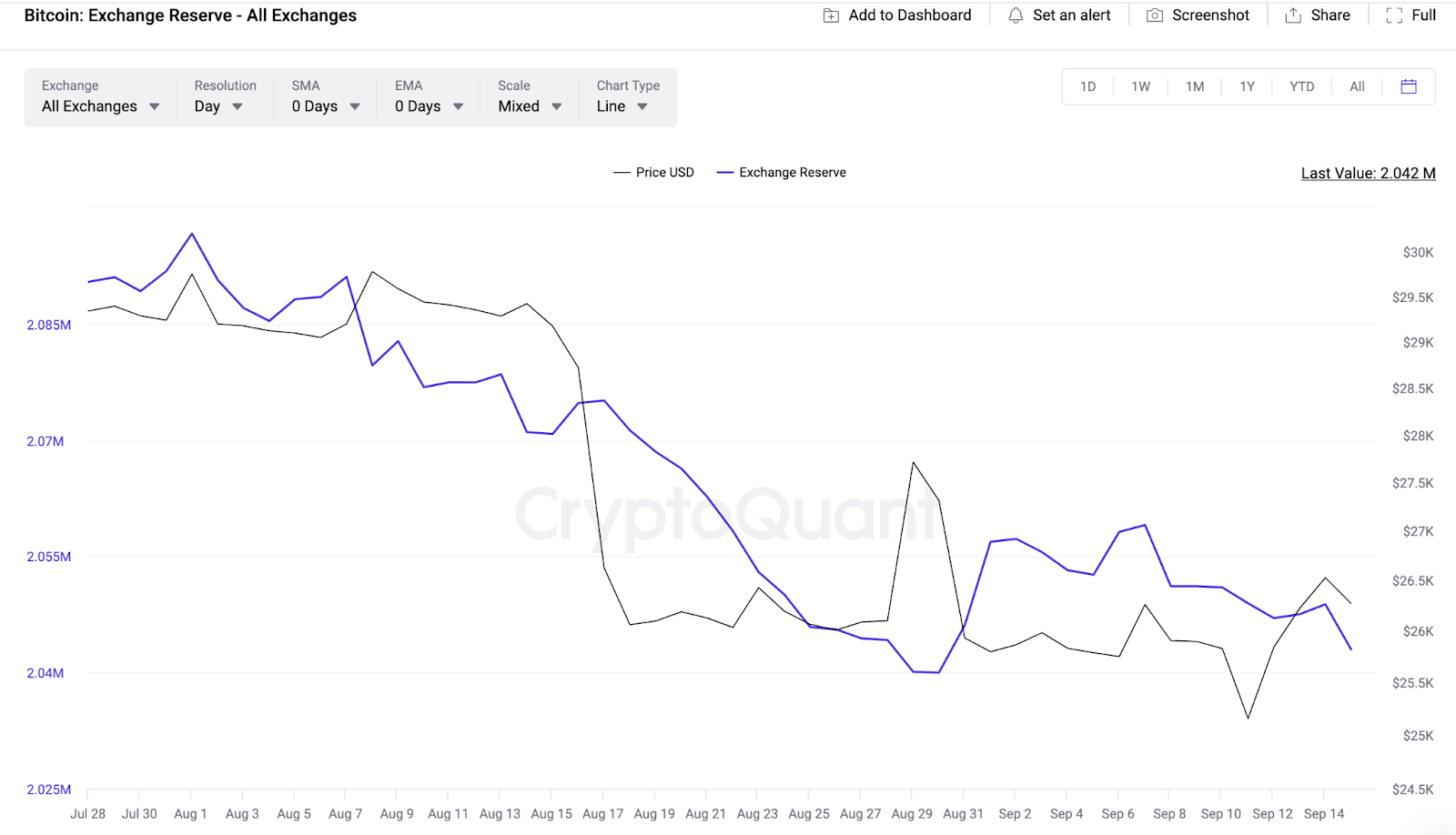 Số liệu Exchange Reserves theo dõi những thay đổi theo thời gian thực về số dư mà các nhà đầu tư hiện đang giữ trong ví trên sàn giao dịch tiền điện tử. Số dư Exchange Reserves giảm nhanh chóng hàm ý nhiều người nắm giữ lựa chọn tự quản lý và có thể hạn chế bán trong thời gian ngắn. Nếu sự suy giảm này tiếp tục diễn ra trong những ngày tới, giá Bitcoin có thể còn tăng thêm nữa.