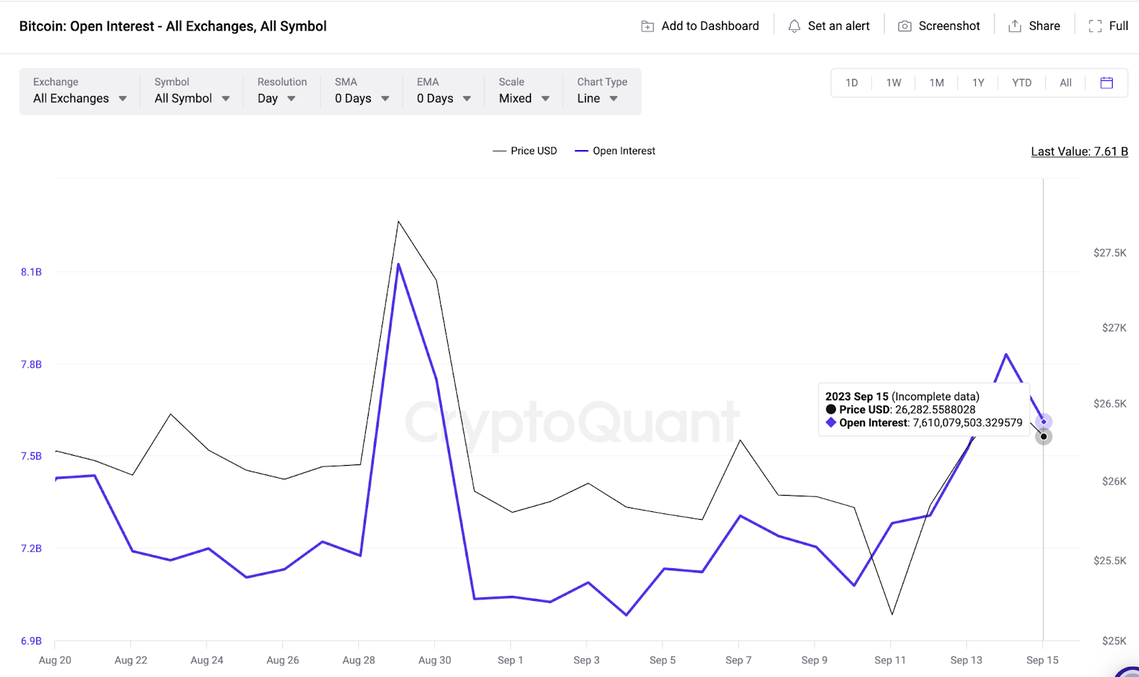 Từ ngày 01/9 đến ngày 15/9, Open Interest của BTC đã tăng thêm 640 triệu USD. Trong khi đó, biểu đồ bên dưới mô tả rằng trước khi dữ liệu CPI được công bố vào ngày 13/9, giá BTC đã giảm tới 8% kể từ khi mất mức hỗ trợ 27,100 USD vào ngày 31/8.
