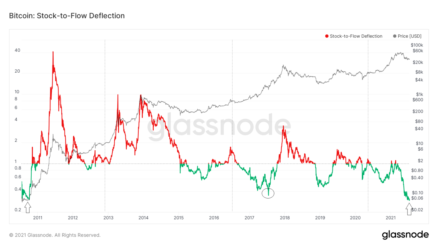 Độ lệch lớn hơn 1 (đường màu đỏ) cho biết BTC được định giá quá cao so với mô hình. Ngược lại, độ lệch nhỏ hơn 1 (đường màu xanh lá cây) cho thấy rằng BTC đang bị định giá thấp.