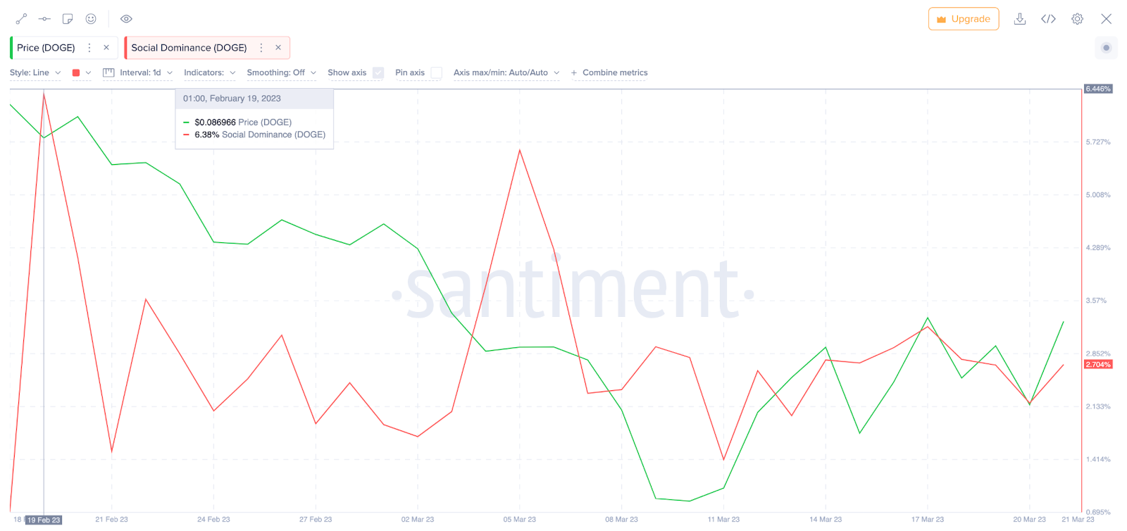 Biểu đồ bên dưới mô tả mức độ thống trị xã hội của Dogecoin đã giảm từ 6.8% vào ngày 19/2 xuống còn 2.6% vào ngày 22/3.