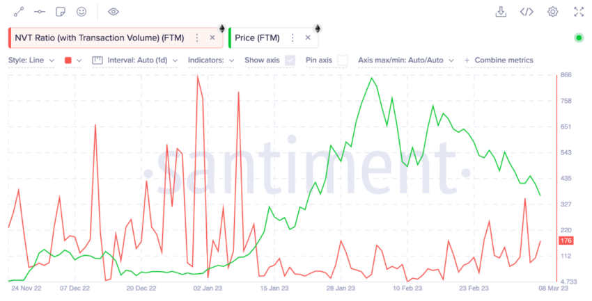 Người nắm giữ FTM đã trải qua một tháng 2 đầy biến động khi giá đồng coin này giảm sút đột ngột lên tới 18%. Token gốc của mạng lưới DeFi lớn thứ 8 theo tổng giá trị bị khóa không cho thấy dấu hiệu phục hồi trong tuần đầu tiên của tháng 3. Theo công ty phân tích dữ liệu tiền điện tử Santiment chỉ báo NVT cho thấy giá FTM có thể giảm trong những tuần tới.