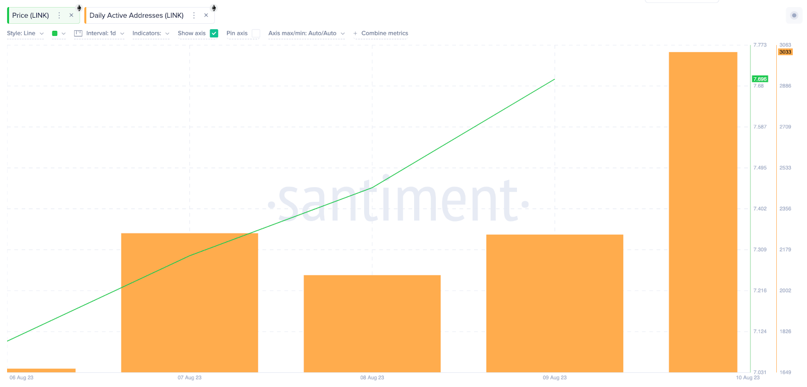Hơn nữa, Chainlink cũng đã chứng kiến sự gia tăng đáng kể trong hoạt động mạng (network activity) kể từ khi nguồn cấp giá độc quyền của nó được tích hợp vào mạng Base vào ngày 08/8. Theo dữ liệu on-chain LINK được cung cấp bởi Santiment, mạng Chainlink chỉ thu hút được 1,666 địa chỉ hoạt động vào ngày 06/8. Nhưng đến ngày 10/8, nó đã tăng vọt 82% để đạt 3,033 địa chỉ ví hoạt động.