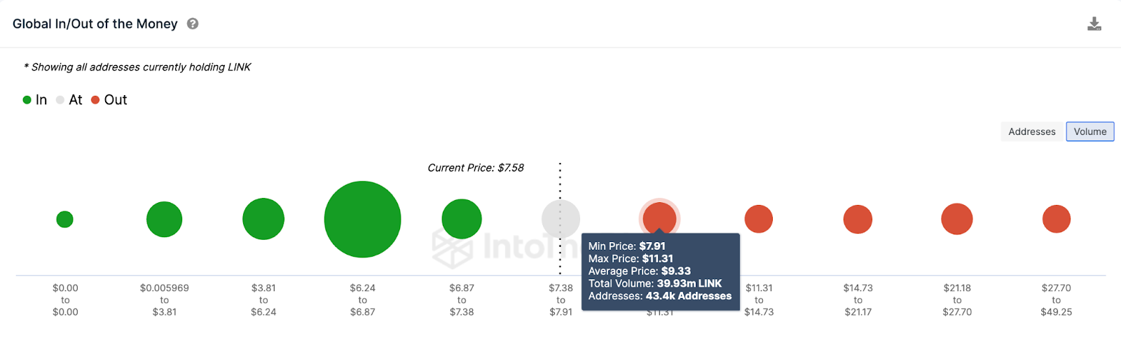 Dữ liệu on-chain LINK Global In/Out of Money (IOMAP) mô tả các mức hỗ trợ và kháng cự chính bằng cách phân tích viêc phân bổ giá mua quan trọng của tất cả những người nắm giữ hiện tại. Nó cho thấy rằng vùng 9 USD tạo ra mức kháng cự mạnh nhất, có thể ngăn LINK đạt được mục tiêu giá 10 USD.