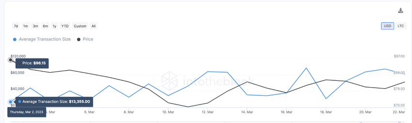Theo IntoTheBlock, một công ty phân tích dữ liệu blockchain, độ lớn giao dịch trung bình (average transaction size) của LTC đã tăng hơn 600% vào tháng 3/2023. Biểu đồ bên dưới minh họa rằng quy mô giao dịch LTC trung bình đã tăng từ 13,355 USD vào ngày 02/3 lên 81,022 USD vào ngày 23/3. Điều này thể hiện mức tăng gấp sáu lần trong các giao dịch lớn.
