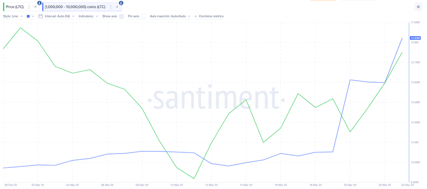 Đáng chú ý, xu hướng tích lũy gần đây giữa một nhóm cá voi quan trọng càng xác nhận lập trường tăng giá này. Dữ liệu Santiment cho thấy áp lực mua từ các nhà đầu tư cá voi Litcecoin nắm giữ từ 1 triệu LTC đến 10 triệu LTC. Đường màu xanh lam trong biểu đồ bên dưới cho thấy cá voi bắt đầu mua vào ngày 01/3, khi giá altcoin này giảm. Từ ngày 01/3 – 24/3, nhóm holder này đã mua 900,000 LTC trị giá khoảng 80 triệu USD.