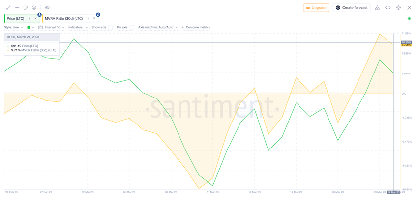 Cá voi đang tận dụng đợt điều chỉnh Litecoin gần đây để mua khi giá giảm. Xem xét chỉ số MVRV hiện tại so với quá khứ, giá LTC dự đoán tiến lên mức 100 USD, hoặc có thể tiếp tục tăng lên 115 USD.