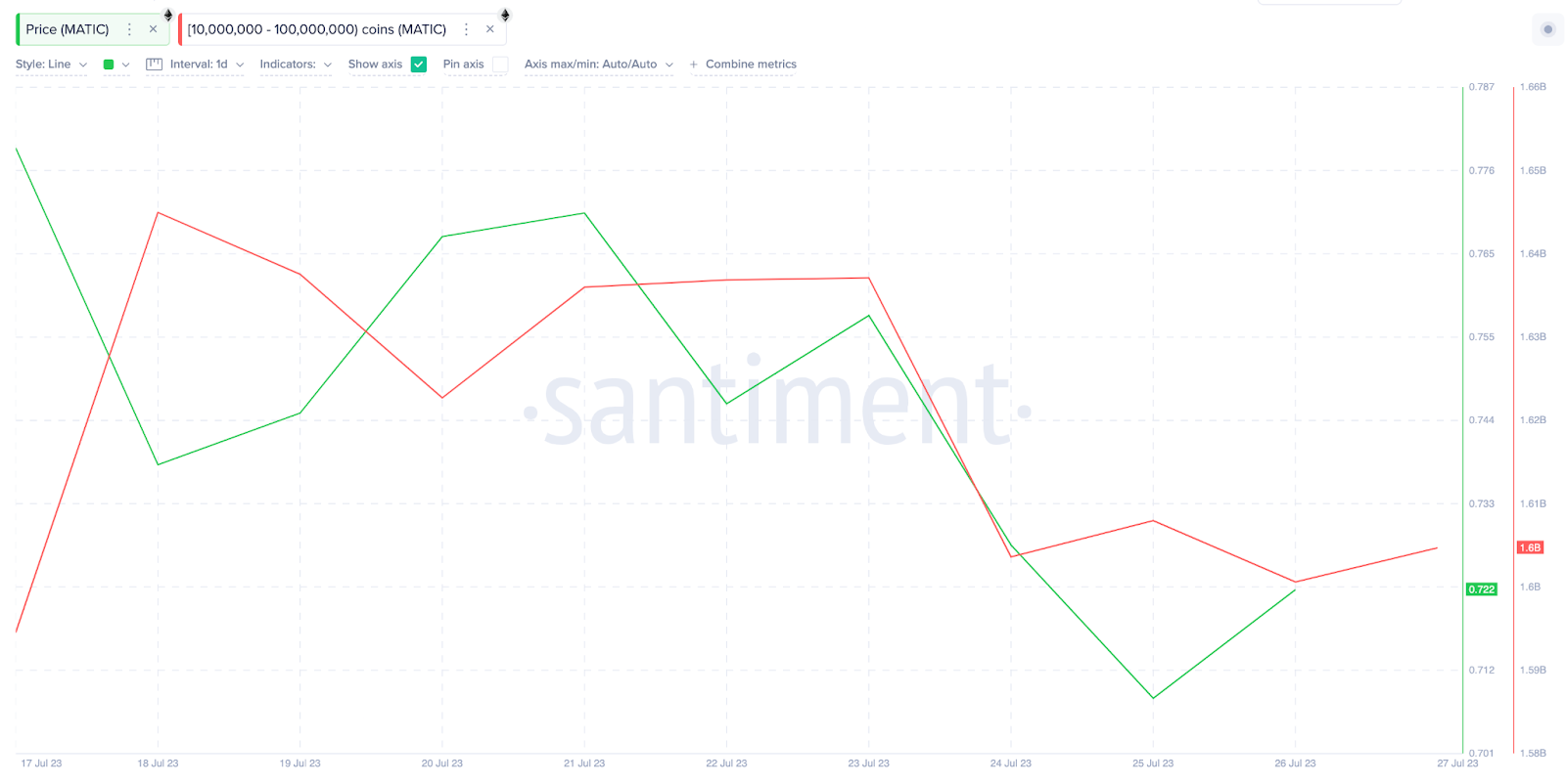 Hơn nữa, một nhóm các nhà đầu tư cá đã bắt đầu có các vị thế bán trên MATIC. Điều này xác nhận mối lo ngại xung quanh việc di chuyển từ MATIC sang mã thông báo POL. Cụ thể, những con cá voi nắm giữ số dư từ 10 triệu đến 100 triệu MATIC đã bán hết 23 triệu MATIC trong khoảng thời gian từ ngày 18 đến ngày 27/7.
